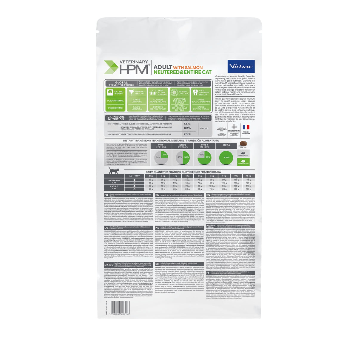 וירבק סלמון לחתולים בוגרים (מסורסים ושלמים) 7 ק״ג Virbac Veterinary HPM Adult Neutered & Entire with Salmon