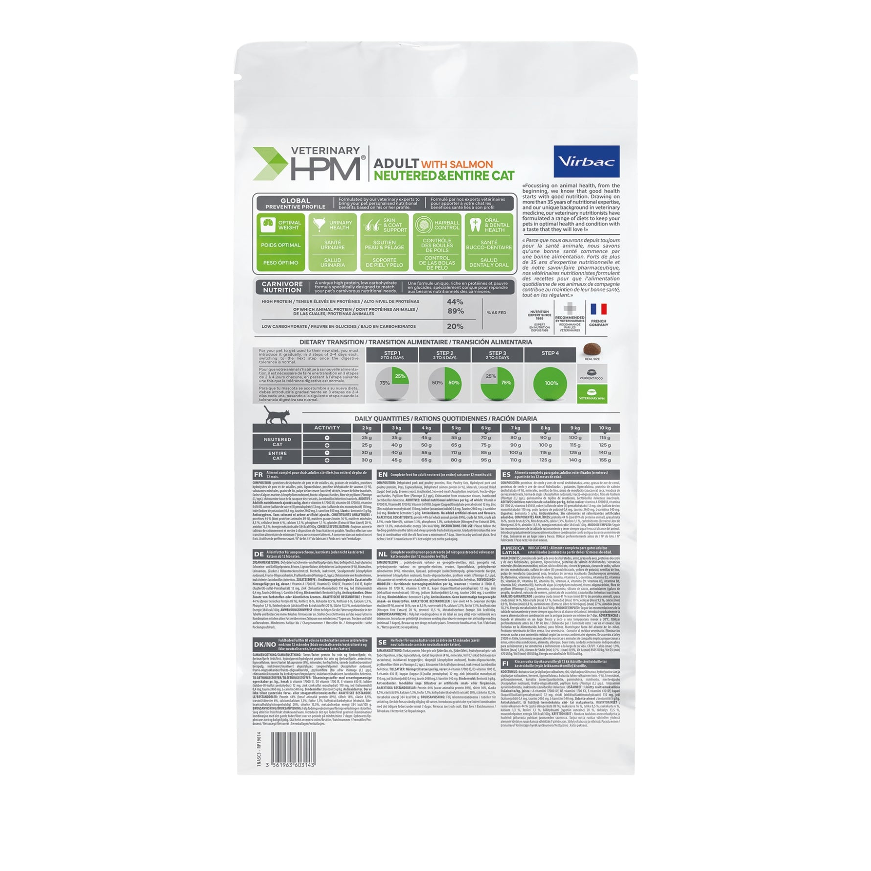 חתולים הם טורפים, ולכן זקוקים לתזונה המבוססת בעיקרה על חלבון מן החי. מוצר זה, המועשר בסלמון, פותח על בסיס עקרון ה-LC-HP (דל פחמימה, עשיר בחלבון) של וירבק. הוא מכיל 89% חלבון מן החי (חזיר, עוף וסלמון), המספק פרופיל חומצות אמינו מלא החיוני לבריאות החתול.