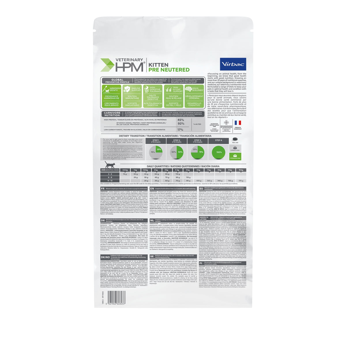 גורי חתולים הם טורפים קטנים עם דרישות תזונתיות עצומות. בשנה הראשונה לחייהם, הגוף שלהם נבנה בקצב מסחרר, ולשם כך הם זקוקים לדלק האיכותי ביותר. סדרת ה-Veterinary HPM של וירבק פותחה סביב עקרון ה-LC-HP (דל פחמימה, עשיר בחלבון), המדמה את התזונה הטבעית של החתול בטבע.
