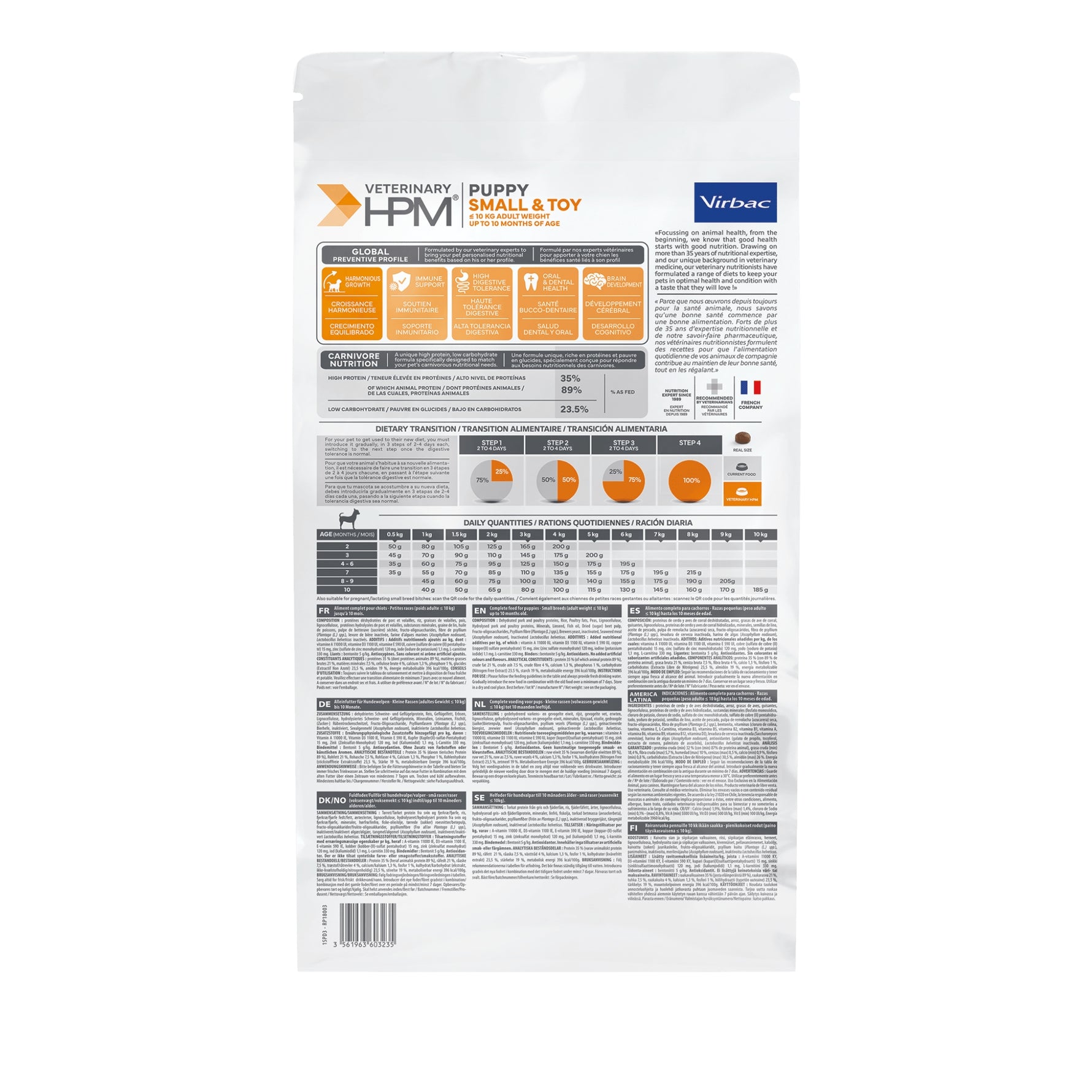 Virbac Veterinary HPM Puppy Small & Toy הוא מזון מלא ומאוזן שפותח במיוחד כדי לענות על הצרכים התזונתיים הייחודיים של גורי כלבים מגזעים קטנים וזעירים (משקל בוגר עד 10 ק"ג), עד גיל 10 חודשים. הנוסחה הייחודית מבוססת על עקרון "דל בפחמימות – עשיר בחלבון", ומספקת אנרגיה גבוהה לגדילה מהירה, תמיכה במערכת החיסון והתפתחות מוחית אופטימלית. המזון מתאים גם לכלבות בהריון או מניקות מגזעים קטנים.